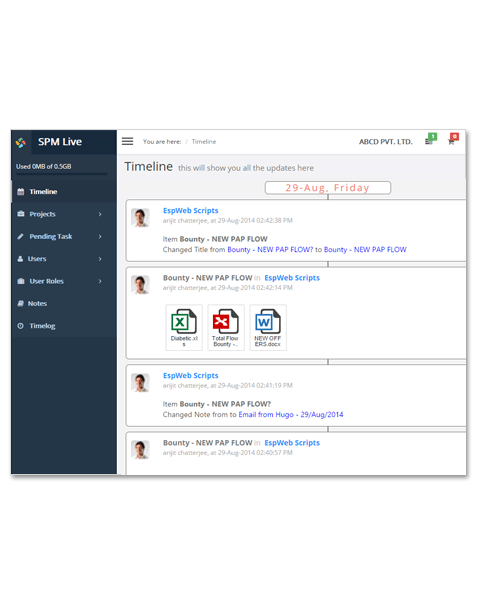 Timeline will show all the activities through out all Projects assign to that user. This helps to see all the updates in current days.